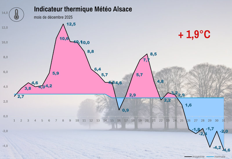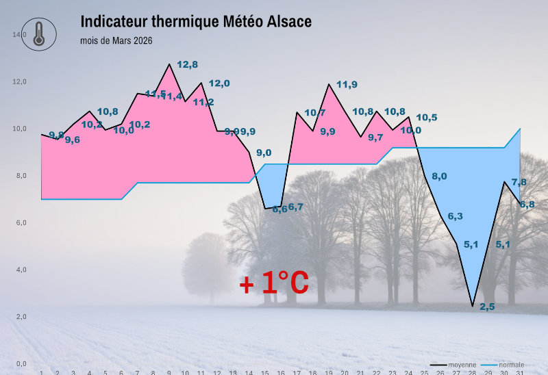 La normale saisonnière annuelle pour la plaine d'Alsace est d'environ 11°C (7° pour les reliefs). Ainsi, on observe que depuis 2010, seules les années 2010 et 2021 rentre dans les normales saisonnières. Toutes les autres années sont largement au dessus des moyennes allant même jusqu'à près de +2,8° pour l'année 2011 et 2014. On remarque également que ces 4 dernières années ont été particulièrement chaudes. Nous dépassons désormais systématiquement les +2°.