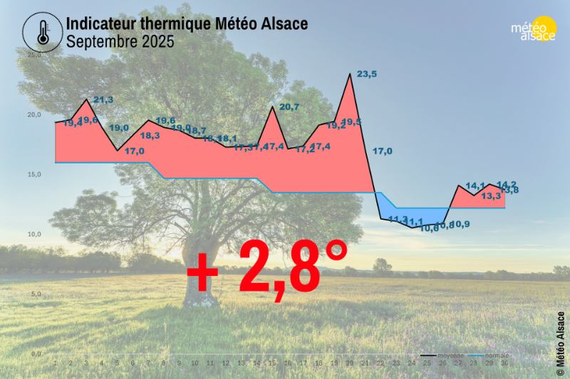La normale saisonnière annuelle pour la plaine d'Alsace est d'environ 11°C (7° pour les reliefs). Ainsi, on observe que depuis 2007, seules les années 2010 et 2021 rentre dans les normales saisonnières. Toutes les autres années sont largement au dessus des moyennes allant même jusqu'à près de 2,8° pour l'année 2014. On remarque également que ces 3 dernières années ont été particulièrement chaudes. L'année 2023 se termine avec 2,6°C tandis que 2024 se termine avec 1,9°C.